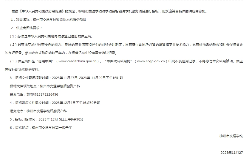 柳州市交通学校智能洗衣服务项目供应商遴选公告